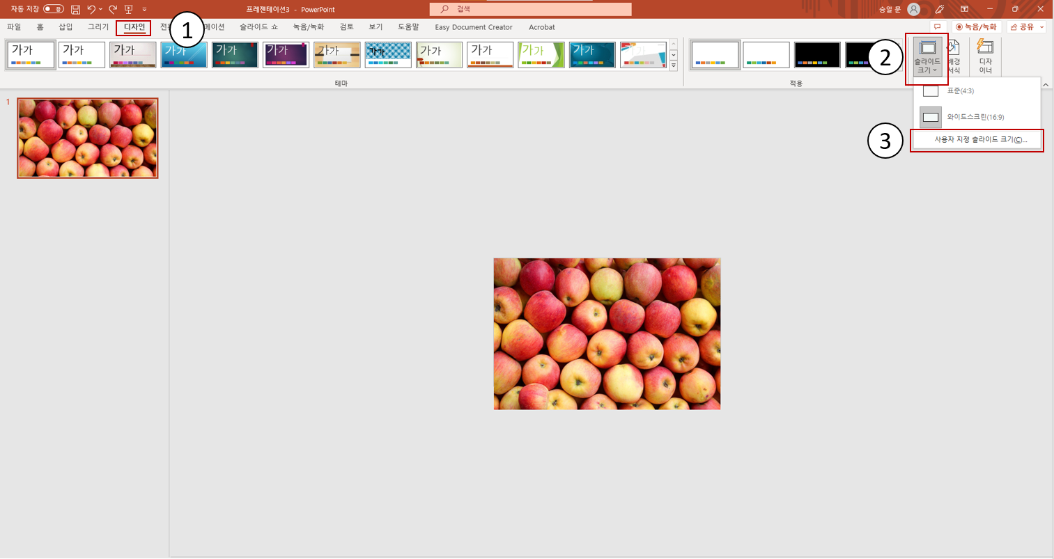 1. 디자인 탭 클릭후 사용자 지정 슬라이드 크기 클릭