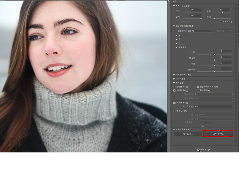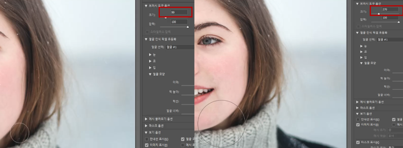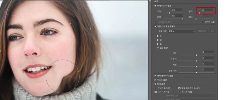 밀도가 낮으면 위 사진과 같이 적은 부분이 수정된다. 밀도가 높으면 더 넓게 수정이 된다. 얼굴 도구를 사용한 방법